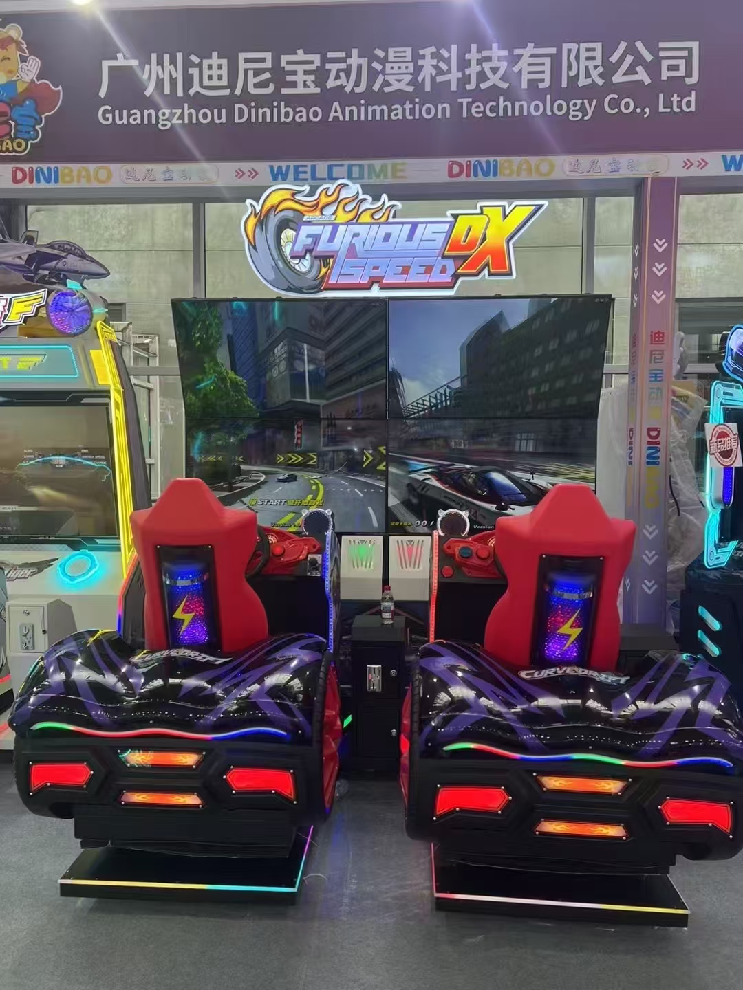 At the latest exhibition, Dinibao proudly unveiled its newest flagship arcade machine: the Furious Speed DX – 4-Screen Dynamic Racing Simulator. This high-end racing game instantly caught the attention of operators and players alike, thanks to its ultra-wide four-screen design, motion seat system, and powerful sound effects. Perfect for arcades, FECs, and high-traffic entertainment centers, Furious Speed DX delivers a thrilling and immersive driving experience that keeps players coming back for more